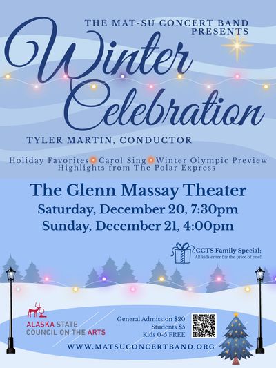 Come enjoy some wonderful holiday music provided by The Mat-Su Concert Band! Two nights filled with familiar favorites and maybe one or two pieces that you may not know. Comprised of all Alaskan talent, you and your family are sure to enjoy the seasonal melodies and Olympic-level sounds that will be a part of the evening.