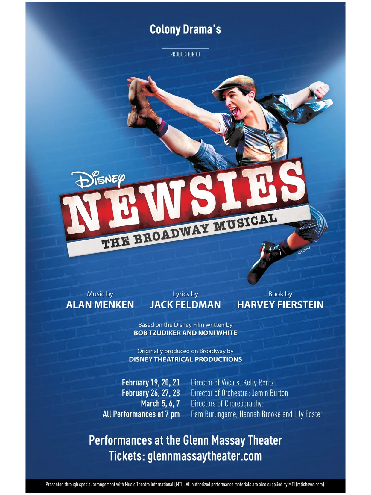 Set in turn-of-the century New York City, Newsies is the rousing tale of Jack Kelly, a charismatic newsboy and leader of a band of teenaged "newsies." When titans of publishing raise distribution prices at the newsboys’ expense, Jack rallies newsies from across the city to strike against the unfair conditions and fight for what's right! Based on the 1992 motion picture and inspired by a true story, Newsies features a Tony Award-winning score by Alan Menken (Little Shop of Horrors, Sister Act) and Jack Feldman and a book by Tony Award winner Harvey Fierstein, Newsies is packed with non-stop thrills and a timeless message, perfect for the whole family and every audience. This production by the Colony High School drama department is sure to be a story worth watching and telling others about!